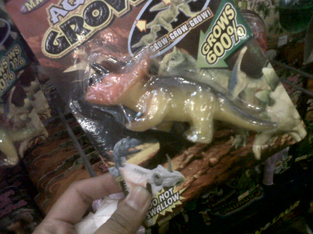 Sewaktu saya di Toys Kingdom Margo, ada mainan yang menarik perhatian saya. Tertulis di bungkusnya bahwa mainan ini akan membesar setiap hari, jika direndam di dalam air. Saya pun membeli satu Dinosaurus. Ukuran awalnya adalah seperti ini: