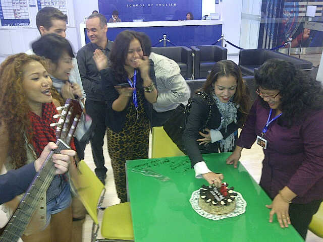 Tepat tanggal 1 Maret jam 5 sore saya mengajak teman-teman saya berkumpul untuk tiup lilin. Saya terharu karena cukup banyak yang menghargai kecintaan saya terhadap Justin Bieber. Dan juga, yang saya tidak sangka acara pemotongan kue ini dimeriahkan oleh petikan gitar. Terima kasih Daniel atas idenya dan Jimmie atas permainannya. Saya dan teman-teman dan beberapa murid menyanyikan “Happy Birthday” dan pada saat pemotongan kue Jimmie mengiringi dengan lagu “Baby“.