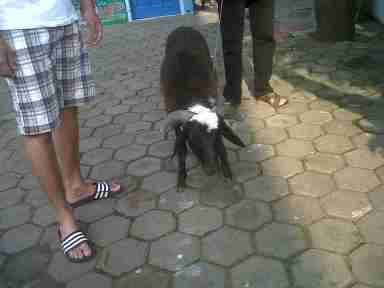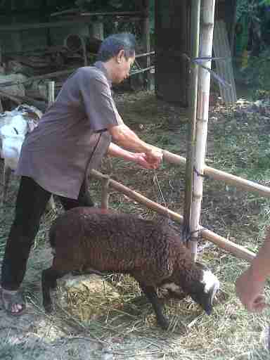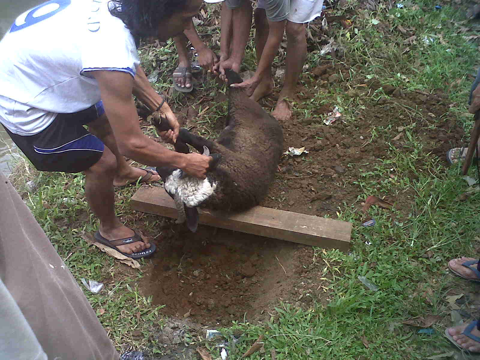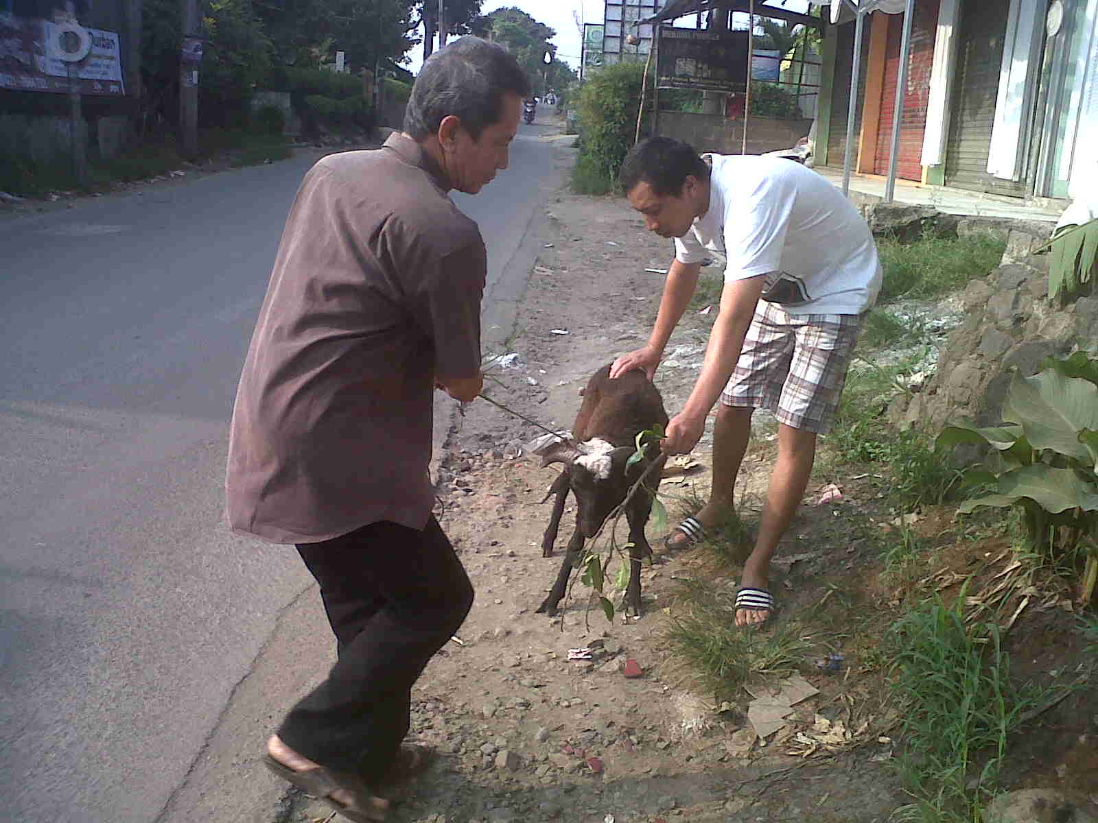 Ketika Papa dan suami saya menggiring si Dombrut ke mesjid, untungnya dia nggak terlalu mogok jalan. Perjalanan cukup lancar meskipun Dombrut sempat takut mendengar suara mobil dan motor, dan harus sedikit susah payah diiming-imingi rumput. Sesampainya di mesjid, sudah banyak kambing, domba dan sapi yang akan dikurbankan. Total ada 12 kambing/domba dan 3 sapi. Ada satu kambing besar yang sepertinya stress! Masa ya dia horny, penisnya kencang dan dia mau kawin sama kambing di sebelah yang tampangnya memelas. Mereka kan sama-sama jantan! Coba deh! Yang bikin emosi, ada kambing tanduk super menyeruduk kepala dan badan domba saya! Apa-apaan!!