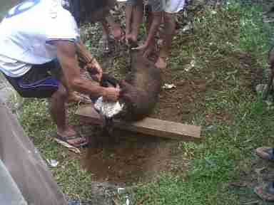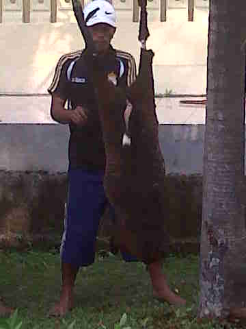 Walaupun urat leher sudah diputus, tapi bukan berarti Dombrut langsung kaku tak bergerak. Perlu beberapa menit untuk itu. Baru setelahnya Dombrut digantung, kepalanya digolok sampai putus, kulitnya disayat dan dipotong-potonglah dagingnya. Sebagai pengkurban saya dapat bagian paha kiri kaki depan. Alhamdulillaah…