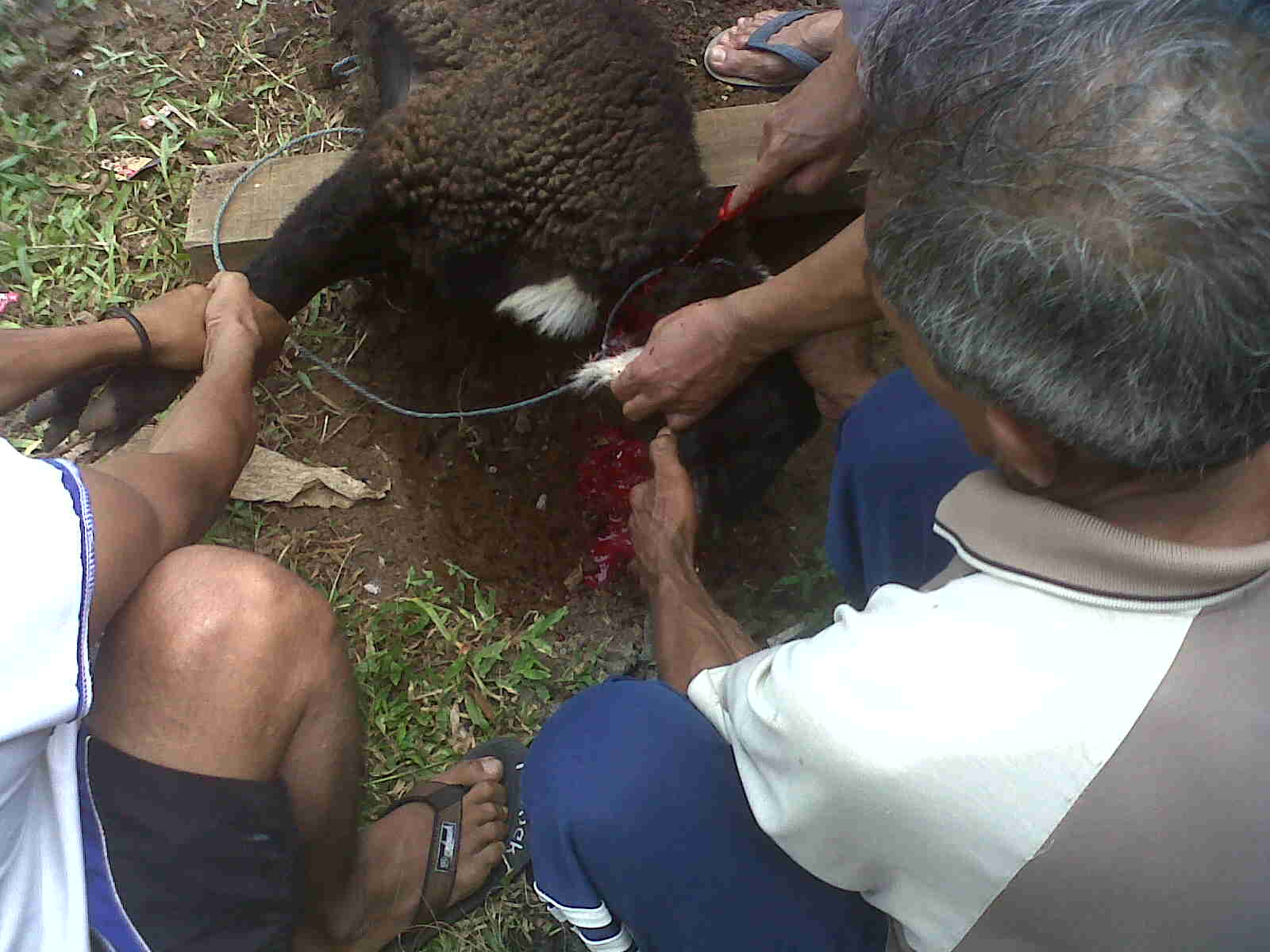 Dombrut dapat giliran dipotong pertama lho! Oleh beberapa orang dan Pak Ustadz, Dombrut digiring ke tempat penyembelihan. Saya, suami dan adik saya mengikuti di belakang. Melihat proses Dombrut disembelih, saya merasa deg-deg-an. Ternyata prosesnya cepat. Domba saya ditidurkan miring, dan kepalanya diletakkan di atas papan kecil yang mana di bawahnya ada lubang untuk tetesan darah. Setelah membaca doa (nama saya disebutkan dalam doa), Pak Ustadz dengan pisaunya yang tajam memotong urat leher Dombrut. Dombrut menggelepar. Dan kematiannya diiringi oleh takbir… Saya pun terharu…