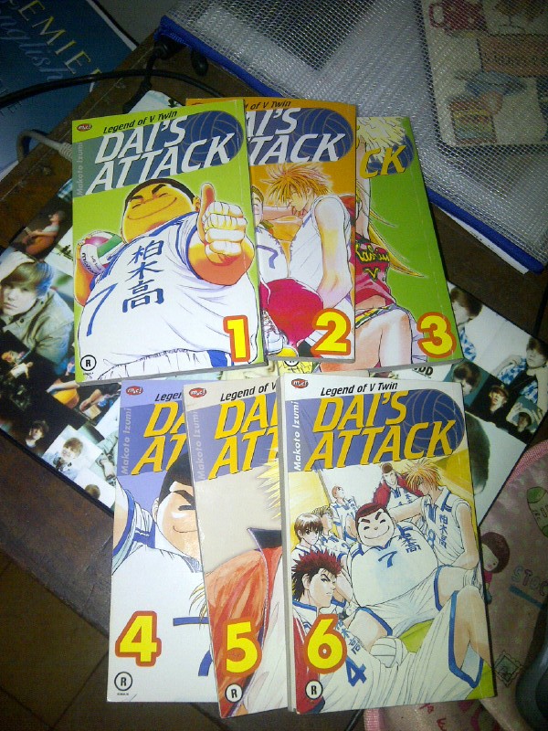 Komik yang terdiri dari enam nomor ini menceritakan tentang dua jagoan dalam olahraga voli. Mereka bernama Dai dan Takekiyo. Dai bertubuh gempal dan pendek, sedangkan Takekiyo gagah perkasa dan tinggi. Meski keduanya sangat berbeda secara fisik dan juga sifat, tapi kekompakan mereka di lapangan sangat luar biasa. Beragam pertandingan mereka jalankan bersama tim voli SMA Kashiwagi sampai akhirnya mereka bisa masuk ke babak final seleksi daerah. Siapa yang menang? Kalian harus baca sendiri ya! Seru banget deh!! Walaupun komik ini tentang olahraga voli yang sepertinya nggak terlalu populer di kalangan remaja Indonesia, cerita Dai’s Attack dijamin akan bikin kalian nggak bisa berhenti baca sampai seri terakhir. Banyak banget adegan yang kocak dan bikin tertawa ngakak. Misalnya ketika Dai hampir ketinggalan kereta, dia pun sekuat tenaga melompat dari satu peron ke peron lain. Dengan tubuhnya yang bulat, seakan-akan melihat bola melambung. Hahaha… Ilustrasinya juga bagus. Garis-garisnya tegas dan nyata. Kita akan benar-benar merasa seperti berada di dalam gedung pertandingan voli yang sesungguhnya. Teks dalam komiknya pun tersusun rapi dan bikin makin enak dibaca. Makanya nggak salah deh kalo Dai’s Attack jadi komik olahraga yang paling saya suka. Dan saya yakin kalian juga akan suka ini.