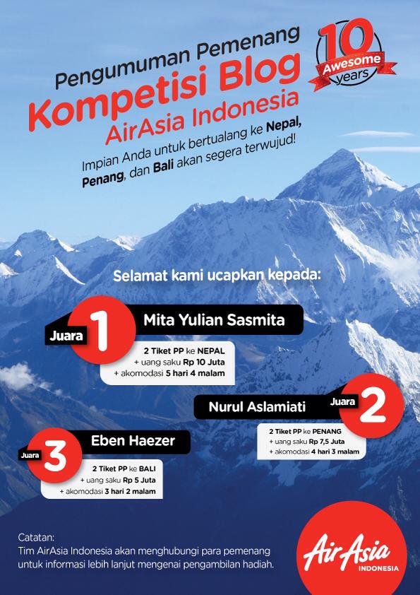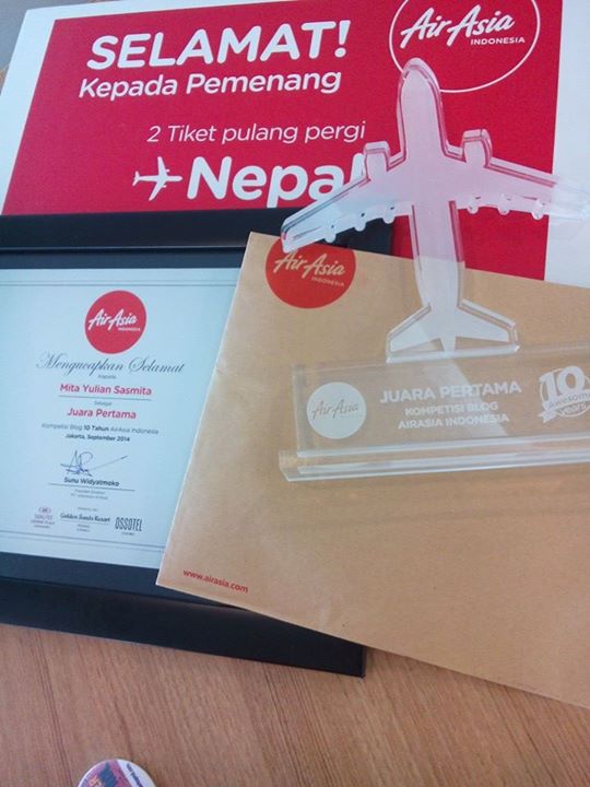 Ceritanya nih, di bulan Agustus 2014 saya ikutan lomba blog oleh AirAsia. Dalam rangka ulang tahun mereka yang ke-10, AirAsia pengen tau bagaimana mereka telah mengubah hidup para penumpangnya. Berhubung saya punya kisah yang kayaknya cocok dengan tema tulisan, dengan lancar saya pun mengisahkan tentang hubungan jarak jauh saya dan suami, yang bisa terjalin karena terjangkaunya harga tiket pesawat dari maskapai asal Malaysia ini. Nggak disangka-sangka, sebulan kemudian ketika pengumuman terpampang di Facebook AirAsiaIndonesia, nama saya muncul sebagai juara pertama! Wiiiwww!! Saya pun menjerit di tengah mengajar sampai murid saya ikutan kaget!