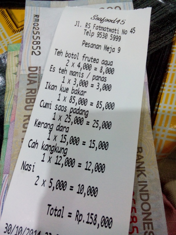 Tadi malam setelah nonton film John Wick (lumayan seru walaupun kurang greget sih latar ceritanya), saya dan suami meluncur ke Jalan Fatmawati. Warung Seafood 45 jadi pilihan suami. 45 adalah nomer bangunan yang pelatarannya jadi lokasi makan. Entah karena kebetulan belaka, atau karena suami saya pernah makan di sana sebelumnya, sajian yang kami pesan rasanya enak banget.