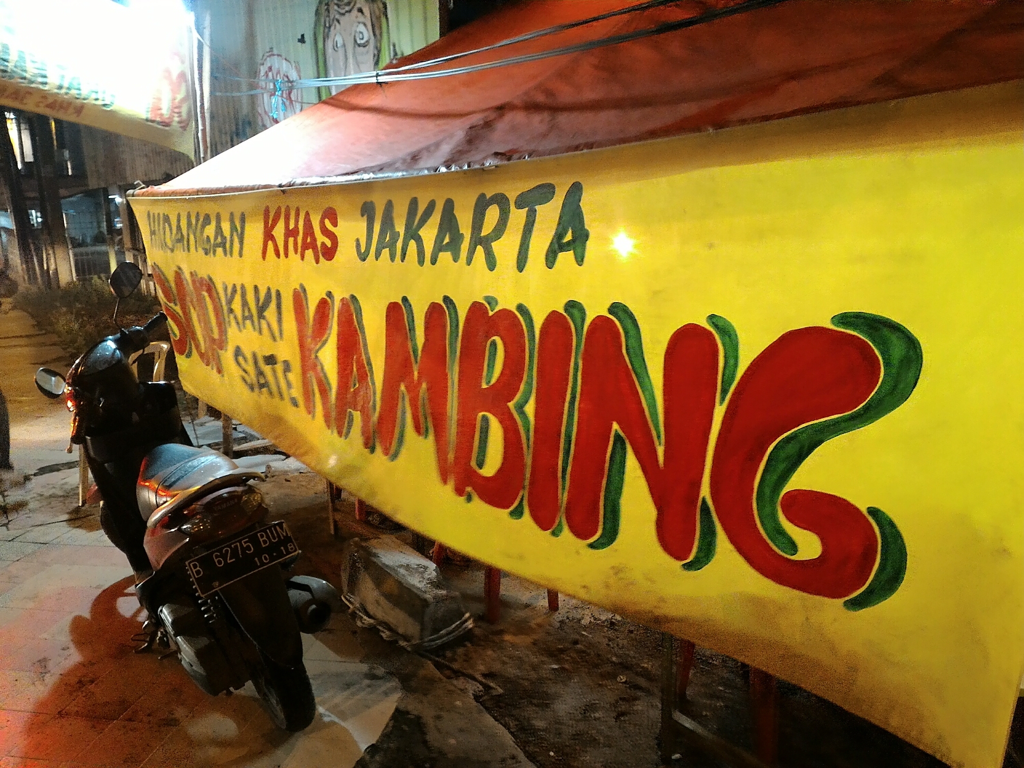 Tidak perlu nunggu lama sampai pesanan kami datang. Perut sudah keroncongan, saya pun langsung menyantap satu tusuk sate. Hmm… Empuk dan nggak bau kambing. Untuk sop kaki kambing, harus dicicip tanpa ditambahin apa-apa. Kuah santannya tidak terlalu kental, dengan lemak nabati menghiasi permukaan, saya dan suami menyesap sesendok kuah. Nikmat… Gurih bumbunya pas, nggak asin, dan isiannya pun terasa enaknya. Beda dengan sop kaki kambing di tenda tetangga dan juga di deretan yang sama, kami udah nyoba; kuah serta isiannya hambar. Ditambah sambal dan kucuran jeruk nipis, sop kaki kambing ini makin nendang.