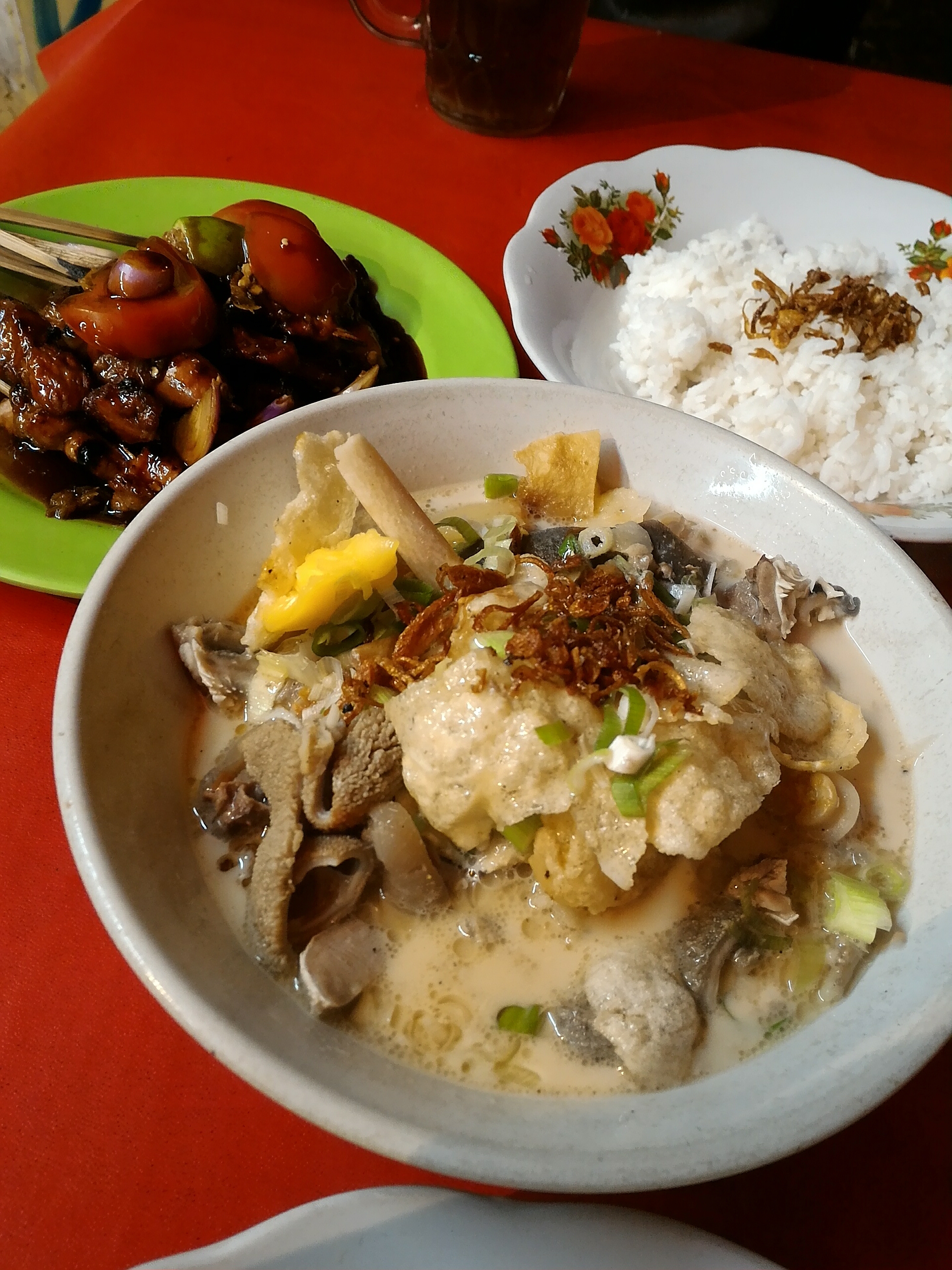 Begitu masuk, kita akan liat 2 konter. Konter kanan khusus penikmat sate ayam dan sop kaki sapi. Saya dan suami belok ke konter kiri, secara suami pencinta sate dan sop kaki kambing. Kami meminta satu mangkuk yang kami isi dengan beragam isian yaitu kaki, lidah, kuping, hidung, daging dan babat. Walaupun hanya semangkuk, isiannya kami isi banyak. Kan ceritanya biar mesra makan semangkuk berdua. Tidak lupa 10 tusuk sate kambing.