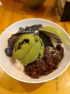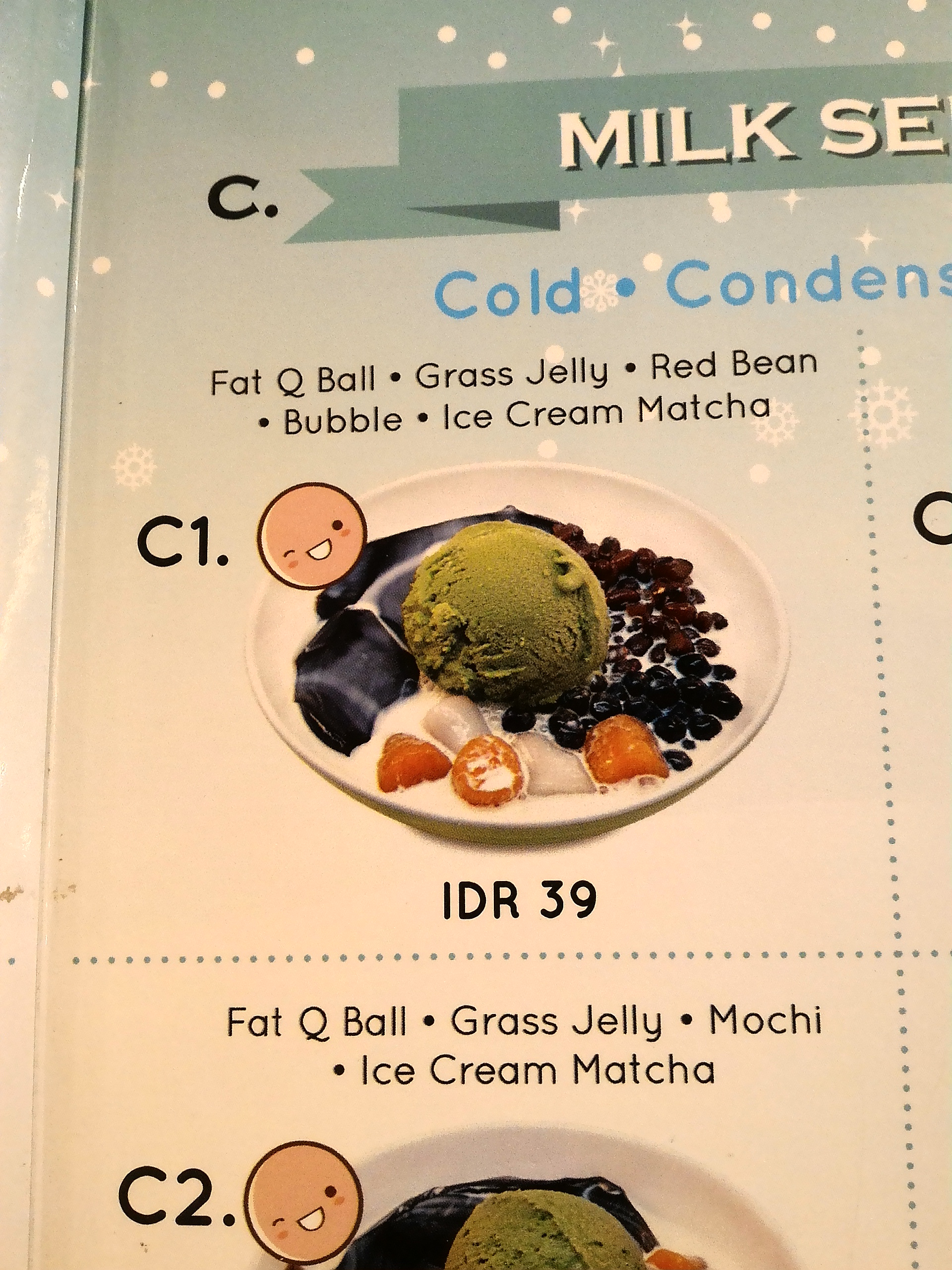Seri susu, kode C1, isi: Fat Q ball, cincau, kacang merah, bubble, es krim teh hijau. Penyuka teh hijau dijamin suka sama rasa es krimnya; nggak terlalu manis tapi teh hijaunya terasa banget. Kacang merahnya lembut dan manis, Fat Q ball-nya kenyal dan seru dikunyah, cincaunya pun nggak terlalu pahit. Ditambah dengan serutan es dan susu kental manis, makanan penutup ini cukup asik. Tapi tetap nggak spesial, biasa aja.