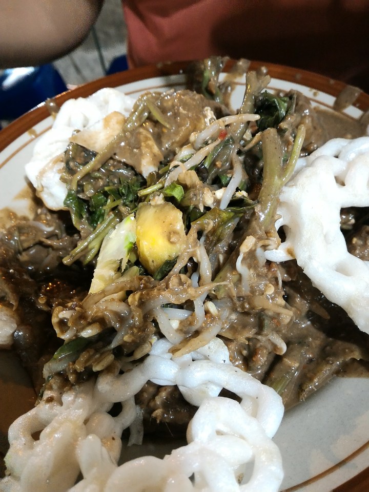 Dengan tiga lembar Rp. 5,000 saya bisa mendapat seporsi Rujak Cingur. Hidangan ini cocok untuk penikmat makanan aneh. Gimana nggak? Campurannya itu lontong, cingur alias bibir sapi, bengkoang, nanas, tahu, tempe, toge, kangkung, kacang panjang dan ketimun. Seperti makan gado-gado dan rujak di satu piring. Hahaha… Bumbu kacang di warung tenda satu ini lembut dan petisnya terasa, aroma harum bawang putihnya pun mengusik indera perasa. Indera pengecap? Oke, saya bukan penyuka makanan ini, tapi pendapat suami saya boleh dipegang, satu kata: Enak! Dan dia mau makan di situ lagi.