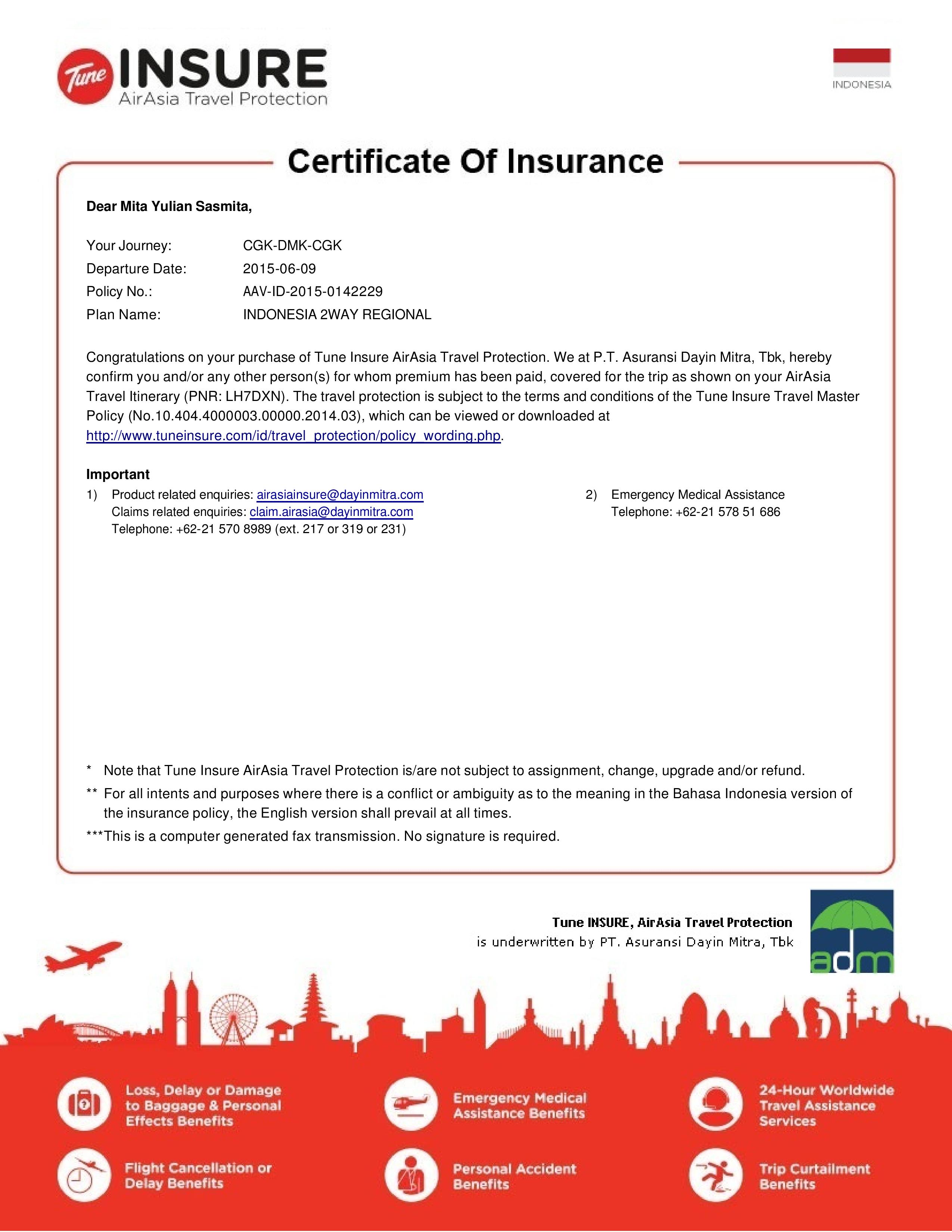 Saya menggeleng sambil merasa malu. Berkali-kali terbang naik AirAsia, cek website mereka buat dapet tiket promo, dikasih liburan gratis pula, eh malah nggak tau tentang Tune INSURE ini. Saya tengok ulang isi inbox, dan ternyata terselip satu email berisi sertifikat Tune INSURE atas nama saya.AAV-ID-2015-0142229-LH7DXN-Mita Yulian Sasmita-EN-page-001Iseng-iseng, saya mulai meng-Google informasi tentang asuransi ini dan menemukan website www.tuneinsure.com. Wow! Terbang dan liburan nyaman dengan maskapai ini ternyata memang sungguhan tidak mahal. Biaya Tune INSURE murah. Hanya dengan Rp. 20,000 sampai Rp. 120,000 kita akan mendapat perlindungan sebelum, selama sampai setelah perjalanan. Jadi, kalopun saya nambahin asuransi ini ke pembelian tiket, tetap nggak tinggi bayarnya. Mendadak saya merasa sedikit membaik karena tahu bahwa liburan saya terjamin, seperti sudah ada “pegangan” gitu lho! Nggak perlu khawatir kalo *amit-amit* keserempet Tuk Tuk. Dan membayangkan bagasi saya juga terlindungi, saya jadi nggak ragu untuk belanja banyak oleh-oleh di Bangkok. Asik!