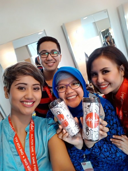 Dengan Senior Flight Attendants, Mbak Pritha dan Mas Efraim, serta Mbak Pramugari cantik AirAsia. Saya dapet hadiah 2 tumbler nih karena bisa menjawab pertanyaan. Salah satunya akan saya hadiahkan ke pembaca blog Terong Gemuk.