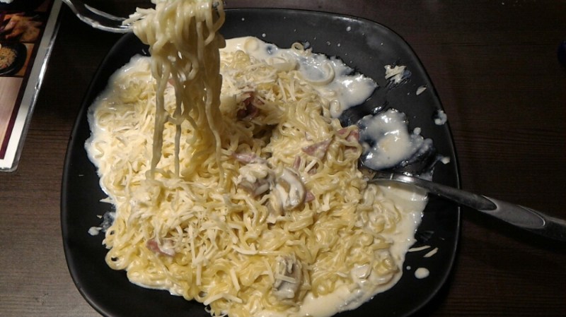 Beda lagi dengan pesanan saya. Disajikan panas dan porsi besar, saus carbonara-nya menggoyang lidah! Apalagi ada irisan bawang bombay yang bikin makin sedap. Jamur dan dagingnya juga gak pelit. Asik banget.