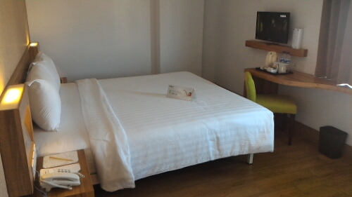 Resepsionis Whiz Prime ramah dan menjawab tiap pertanyaan kami dengan baik. Proses check-in pun tidak berlangsung lama. Tak sampai sepuluh menit, kami sudah mendapatkan kunci kamar. Terletak di lantai 7, kamar kami non-smoking dengan pemandangan kota terlihat dari jendela. Toilet dan kamar mandi terpisah, dengan dilengkapi perlengkapan mandi. Salah satunya sikat gigi! Nggak semua hotel lho menyediakan ini, ada hotel bintang 4 yang nggak kasih sikat gigi kalo nggak diminta.