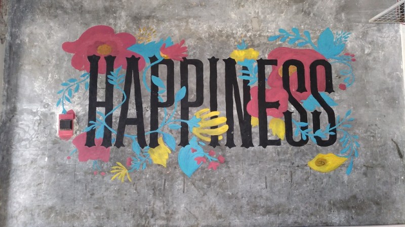 Dari luar, Happiness Kitchen & Coffee memang sudah terlihat beda. Bangunannya ala ala rumah bergaya ranch dengan dinding dari bilah-bilah kayu yang cat-nya mengelupas seakan-akan dimakan waktu. Halaman depan cukup luas dan diisi meja bundar serta segi empat. Parkiran ada di sisi kanan. Dinding sebelah kiri ada ilustrasi seorang pria di bawah hujan hati warna-warni, sedang menunjukkan kotak cincin kosong.