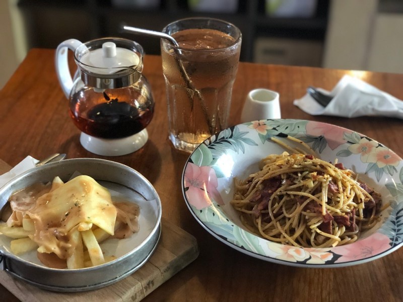 Mata saya menatap langit-langit, lalu ke rak yang dipenuhi banyak gelas kertas dan kantong kopi. Earphone di telinga, Spotify menyala, pulpen dan halaman-halaman kertas cokelat di tangan. Beberapa jam berlalu. Entah berapa lagu sudah terputar, berapa kata sudah tertulis di jurnal, saya masih duduk di nyamannya kafe ini. Tak terasa, sudah tengah hari. Segelas teh blackcurrant hibiscus dingin, kentang goreng bersiram keju dan bawang bombay, serta pasta aglio olio saya mantapkan pesan. Kepalang nyaman, sekalian aja makan siang di sini.
