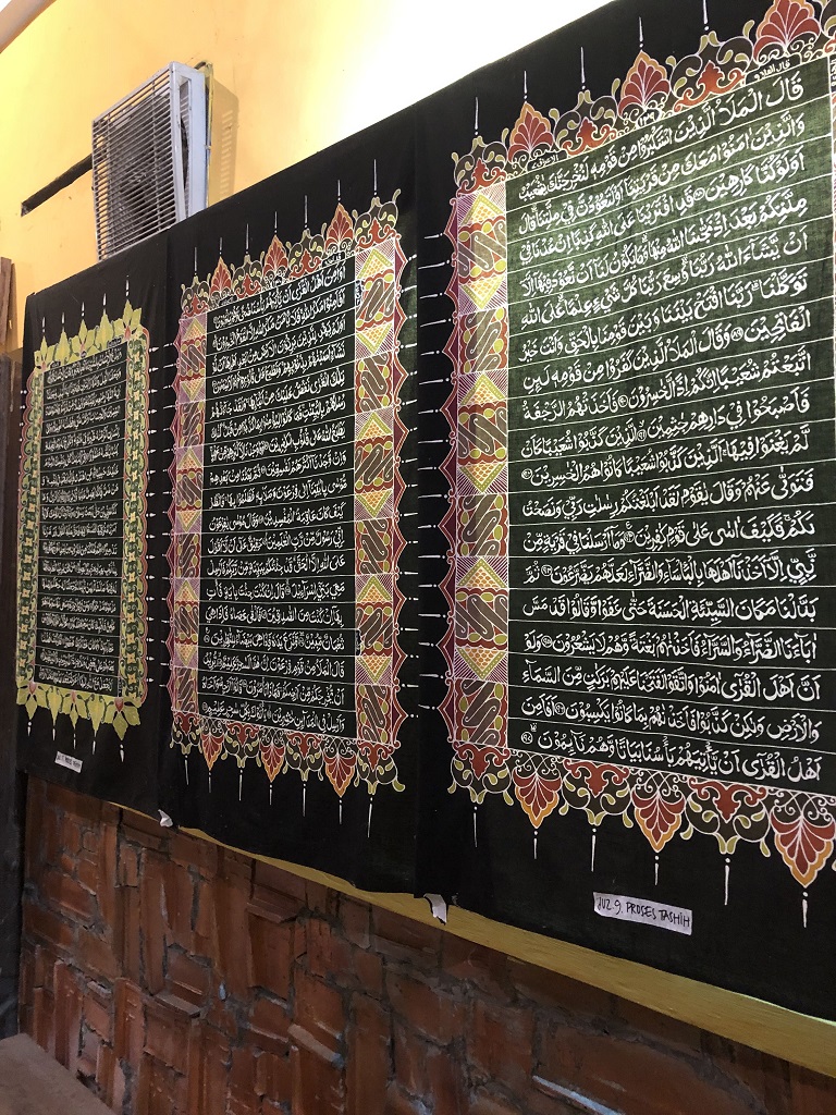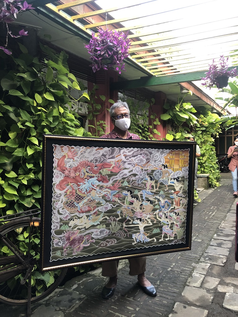 Setelahnya, kami diajak ke Kampung Batik Mahkota Laweyan untuk belajar membatik. Ada cerita menarik di sini. Tahun 2020 menjadi tahun di mana penjualan mereka sangat terpuruk karena pandemi. Mereka lalu memutuskan untuk membuka toko online di Tokopedia dan alhasil profit mereka meningkat 7x lipat. Luar biasaaa. Di Kampung Batik Mahkota Laweyan, saya dan teman-teman pegiat media sosial juga bisa menikmati karya Batik dengan beragam tema. Mulai dari kisah banjirnya Sungai Bengawan, sampai Corona. Bahkan, ada Batik Al-Qur’an juga yang saat ini sedang proses pengecekan untuk memastikan tidak ada huruf yang salah. Keren!