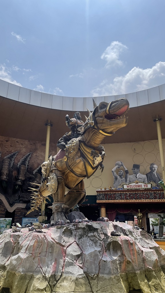 Sebenernya, nggak ada alasan khusus. Berhubung saat itu saya ke Surabaya karena mau nengokin keponakan-keponakan yang lagi sekolah di Madura dan Malang, jadilah saya mengajak keponakan yang di Madura untuk pergi bareng mengunjungi keponakan yang di Malang. Trus, karena mikirnya mau seharian aja di satu tempat, maka saya pun memilih Jatim Park, taman bermain di Batu (dulunya masuk bagian Malang tapi kini menjadi kota sendiri), sebagai tujuan kami bersenang-senang. Memilih Dino Park di Jatim Park 3 (ada Jatim Park 1 dan 2 dengan tema yang beragam) sesederhana karena saya belum pernah pergi ke tempat bertemakan dinosaurus.