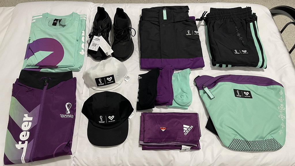 Satu set seragam terdiri dari sepasang sepatu, dua celana, dua kaos lengan pendek, satu kaos lengan panjang, satu jaket, satu parka, dua topi, tiga pasang kaos kaki, dan satu tas. Ada juga tambahan pin negara asal relawan dan satu kerudung segiempat untuk mereka yang berhijab. Semua disponsori oleh Adidas.