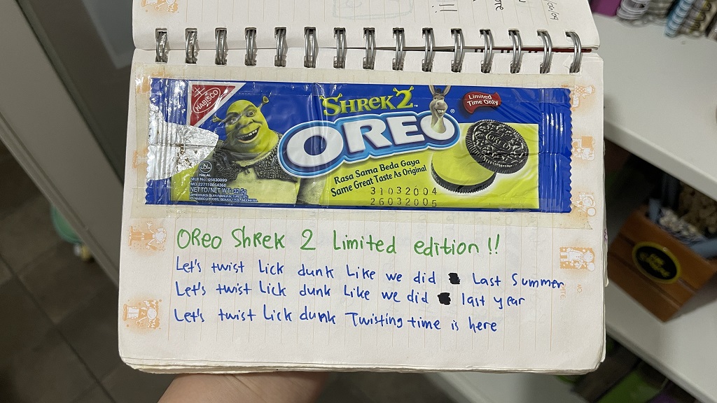 Ada jurnal yang isinya surat-surat, curhat teman, testimoni teman tentang saya, ada jurnal yang diisi bareng sama teman, bahkan ada jurnal khusus gebetan… Ya Tuhan! Geli banget, jurnal gebetan itu diisi tiap hari dengan informasi gebetan saya ngapain, saya ketemu dia di mana, dia ke sekolah naik apa, pake jaket warna apa, sampe ada bungkusan wafer Tango yang doi kasih ke saya pas doi ulang tahun.